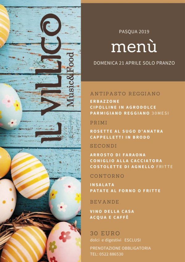Il pranzo di Pasqua al Villico.Antipasto ReggianoErbazzoneCipolline in AgrodolceParmigiano Reggiano 30 mesiPrimiRosette al sugo d’AnatraCappelletti in BrodoSecondiArrosto di FaraonaConiglio alla CacciatoraCostolette di Agnello fritteContornoInsalataPatate al Forno o FritteBevandeVino della casaAcqua e Caffè 30 euro dolci e digestivi EsclusiPrenotazione Obbligatoria Tel:… Continua a leggere →