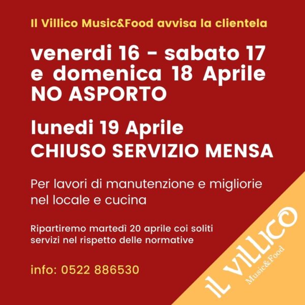 Il Villico avvisa che nei giorni venerdi 16, sabato 17 e domenica 18 aprile, NON effettuerà il Servizio di Asporto e lunedì 19 aprile NON effettuerà il servizio mensa.Faremo lavori di manutenzione e migliorie nel locale e cucina. Ripartiremo martedì… Continua a leggere →